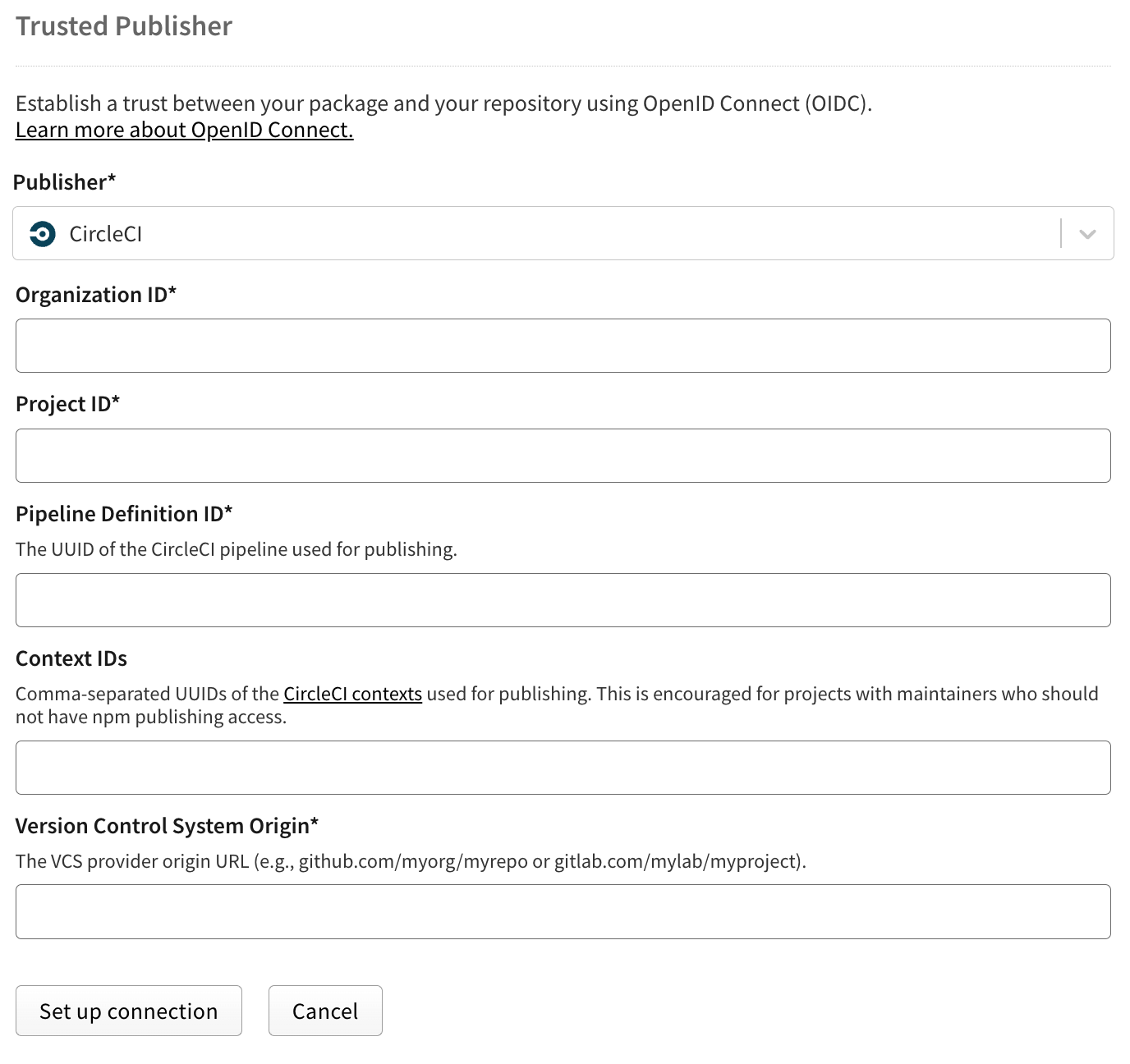 Note: Provenance generation is not currently supported for CircleCI. Packages published via CircleCI trusted publishing will not include provenance attestations.
