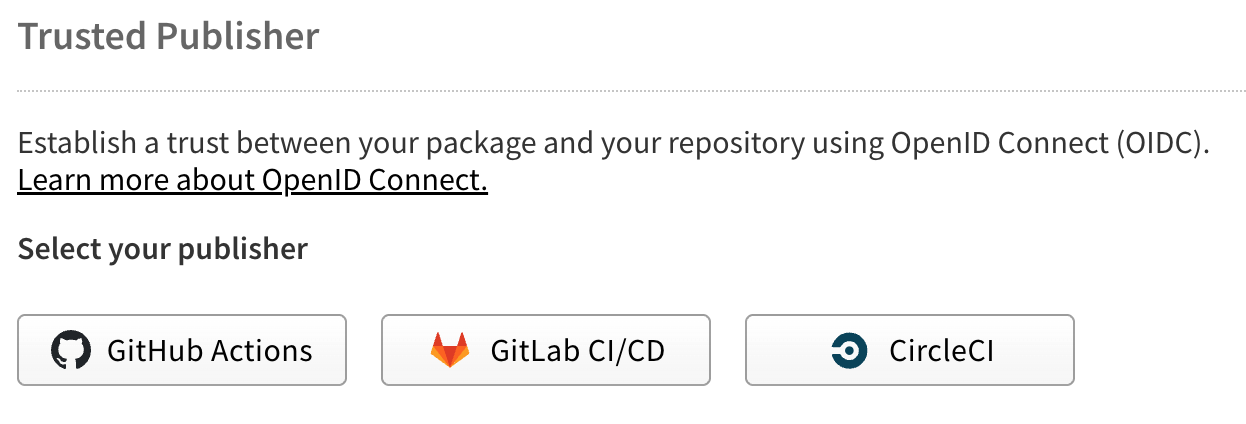 Navigate to your package settings on npmjs.com and find the "Trusted Publisher" section. Under "Select your publisher", choose your CI/CD provider by clicking the GitHub Actions, GitLab CI/CD, or CircleCI button.