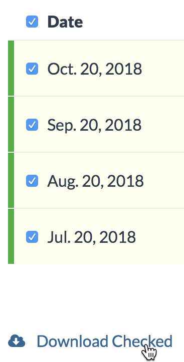 To download multiple receipts, first select the receipts that you wish to download by selecting the box next to the date. To select all receipts, select the checkbox next to the "Date" header. Then click Download Checked.
